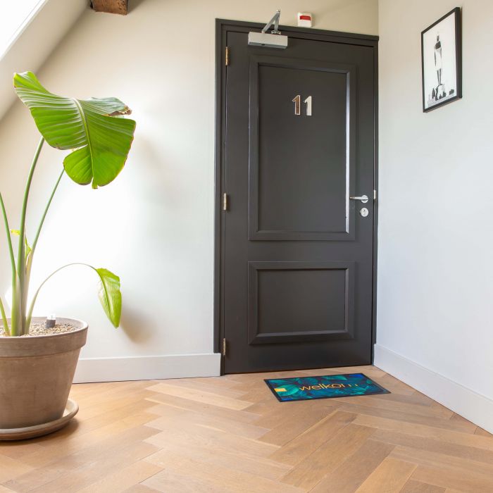 De deurmat met rand is een praktische én esthetische oplossing om je entree een verzorgde uitstraling te geven en tegelijk vuil buiten te houden. De mat is gemaakt van duurzaam polyester met een nitril antisliprug. Standaard is de mat voorzien van een zwarte rand van 2 cm, wat zorgt voor een nette afwerking. De bovenkant is voorzien van een slijtvaste sublimatieprint die jarenlang mooi blijft, zelfs bij intensief gebruik. Het materiaal is vrij van weekmakers en verkrijgbaar in drie veelgebruikte formaten, waardoor er altijd een mat is die past bij jouw deur of ruimte.
